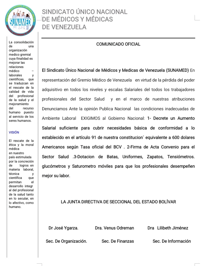 Sunamed Bolívar exige ajustes salariales y dotación de insumos (+comunicado)