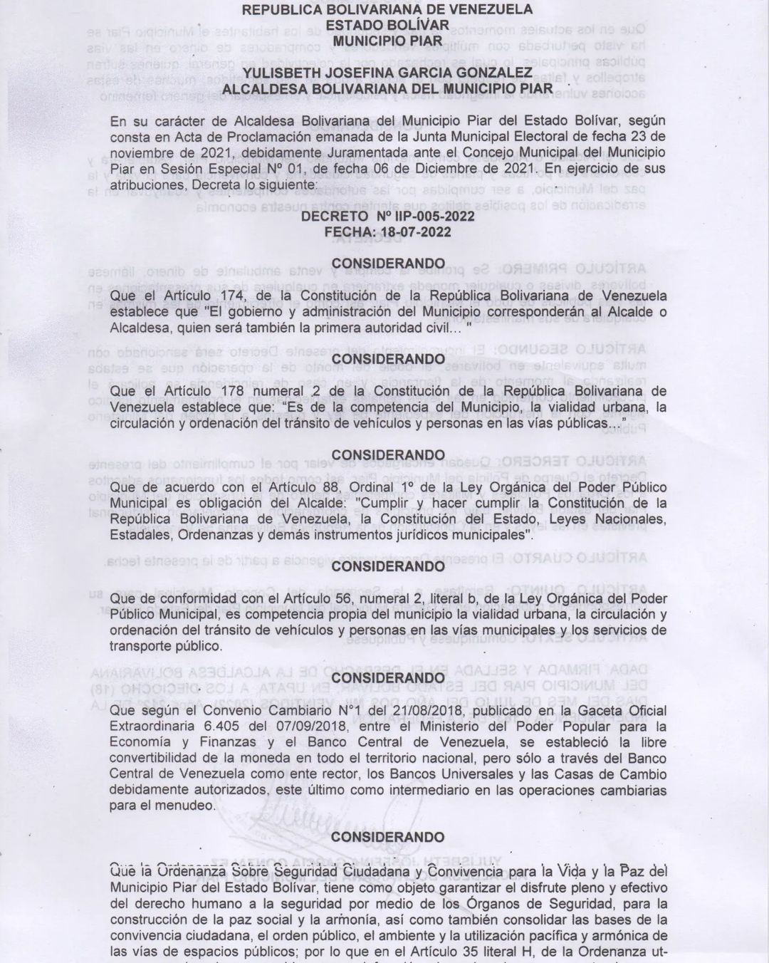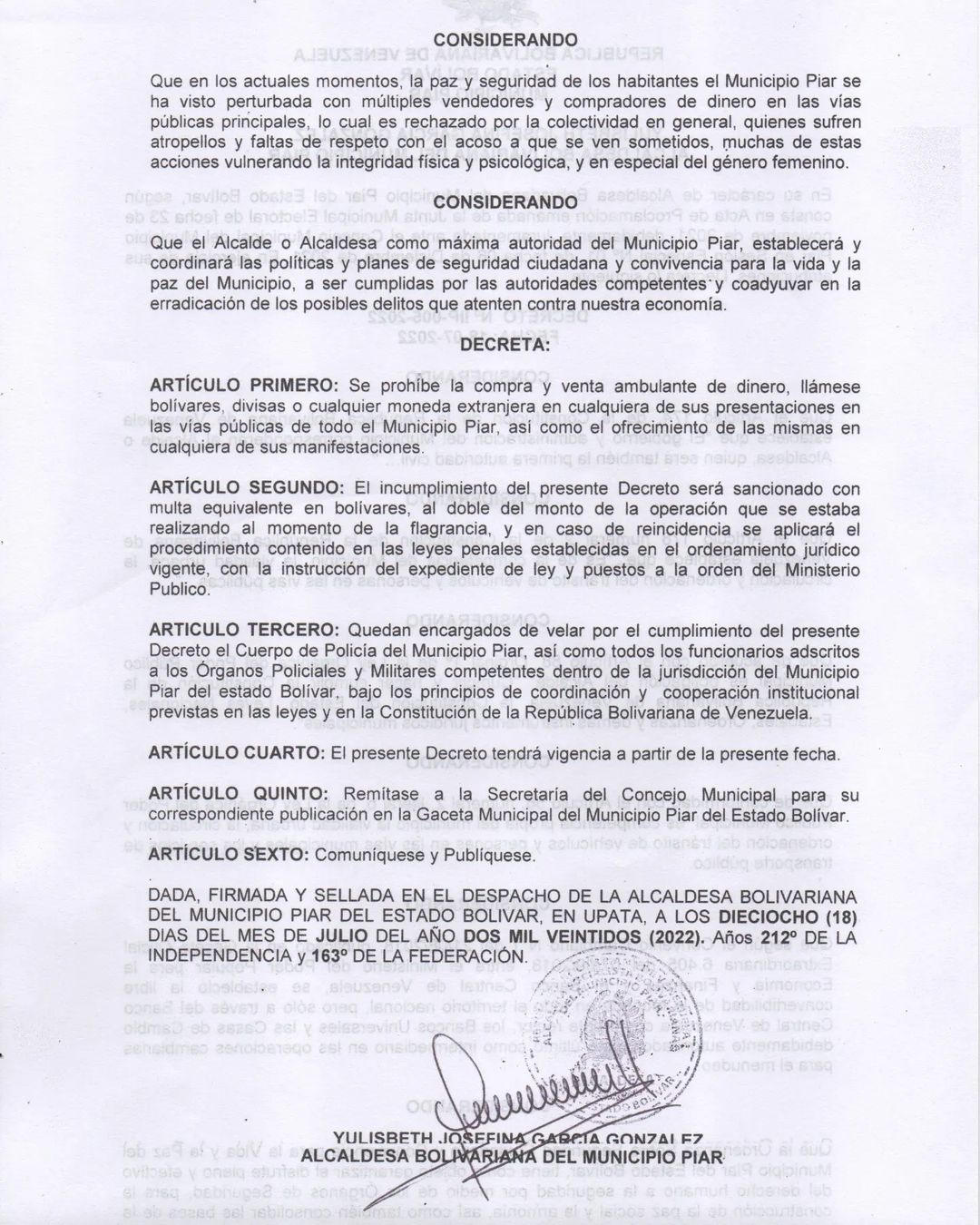 Ante la situación de anarquía en las calles del centro de Upata, la alcaldía de Piar emitió el decreto 005-2022 que prohíbe la compra y venta ambulante de bolívares y divisas extranjeras. La información fue suministrada -la noche de este miércoles- por la alcaldesa del municipio Piar, Yulisbeth García, a través de su cuenta de Instagram (@tatachavista).