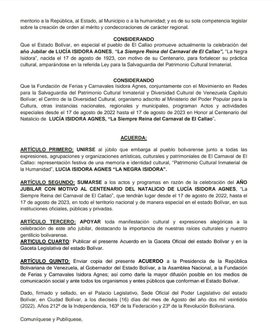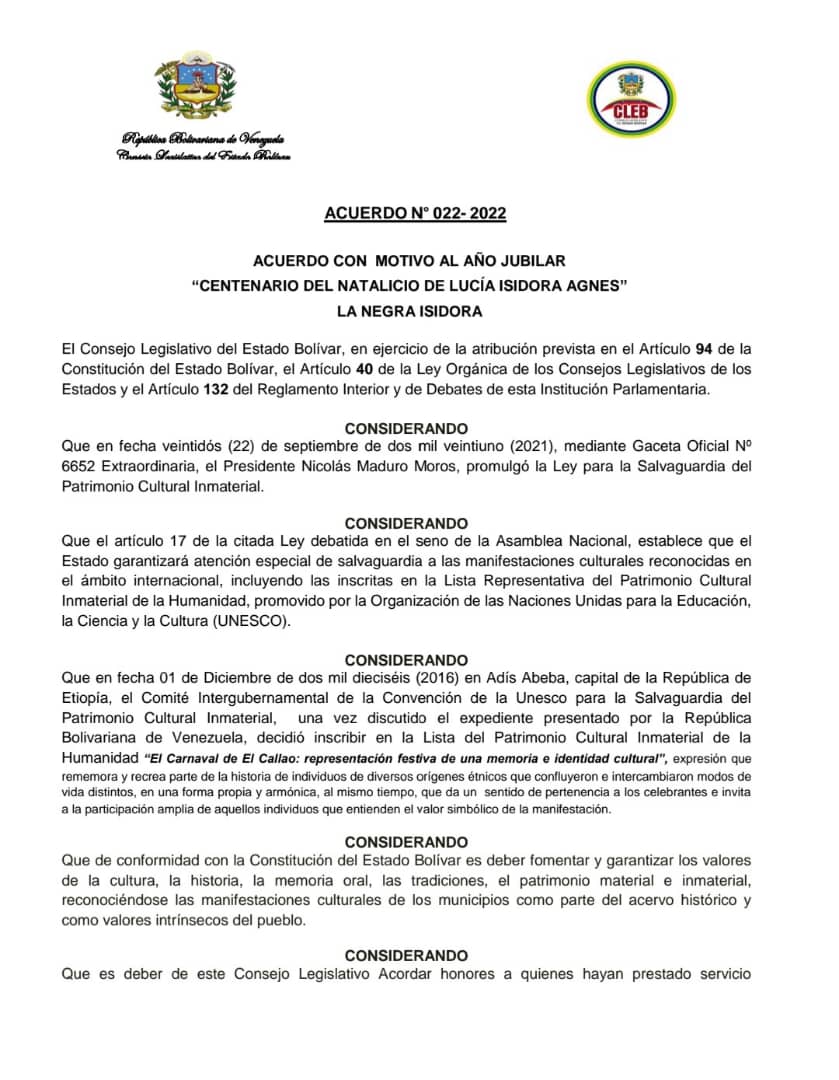 En sesión ordinaria del Consejo Legislativo del estado Bolívar Cleb y por unanimidad fue aprobado el acuerdo del Año Jubilar “Centenario del Natalicio de Lucía Isidora Angnes”, La Negra Isidora.