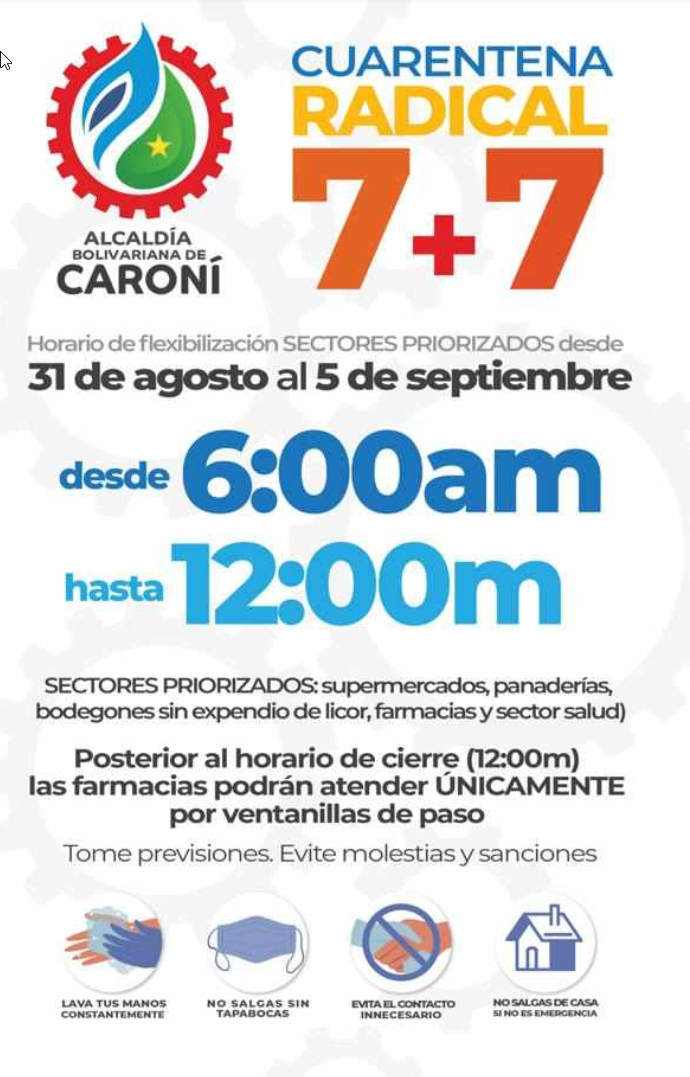 Aunque todavía el Gobierno regional no informa sobre modificaciones de horario, se presume que en territorio bolivarense la actividad comercial priorizada será hasta las 11:00 a.m. y la circulación hasta las 12:00 del mediodía, como en semanas anteriores de radicalización.