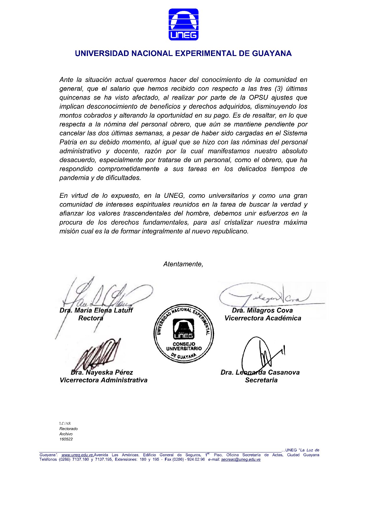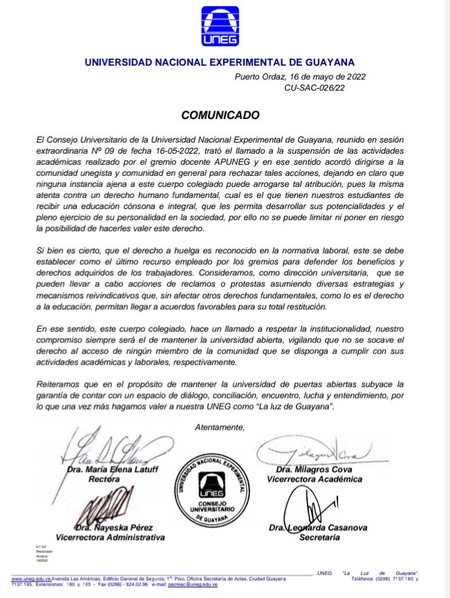 En un comunicado emitido por la Uneg el 16 de mayo, puntualizaron que el Consejo Universitario de la Uneg acordó dirigirse a la comunidad unegista y comunidad en general para dar a conocer la situación presentada con la maqueta de sueldos y salarios a los trabajadores de esta casa de estudios.