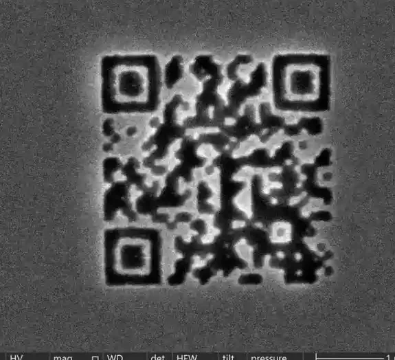 Un código QR grabado con haces de iones