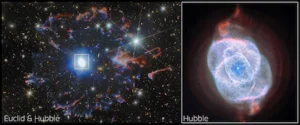 Euclid, diseñado por la Agencia Espacial Europea para cartografiar la materia oscura y la energía oscura en el universo lejano, aportó una visión de campo amplio que reveló el halo periférico de gas y material expulsado por la Nebulosa Ojo de Gato antes de la formación de su núcleo central.