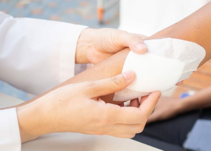 - Secar con cuidado: usa gasas para secar la herida, dando pequeños toques de adentro hacia afuera, sin frotarla.