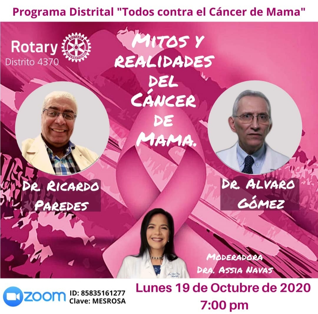 Por otra parte, con el título “Mitos y Realidades del Cáncer de Mama”, la doctora Assia Navas, anunció una videoconferencia pautada para este lunes 19 de octubre, a las 7:00 de la noche vía Zoom.