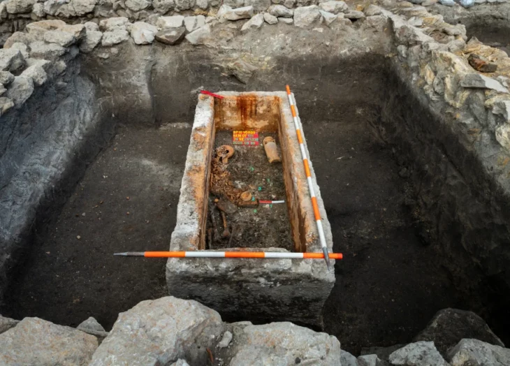 Intacto de saqueadores y sellado durante siglos, el sarcófago fue encontrado con su tapa de piedra aún fija en su lugar, asegurada por abrazaderas de metal y plomo fundido. Cuando los investigadores levantaron cuidadosamente la tapa, descubrieron un esqueleto completo rodeado por decenas de artefactos.