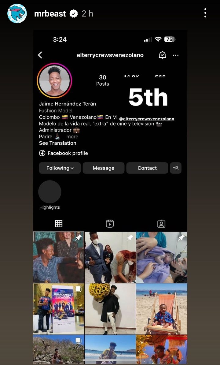 La tarde de este miércoles publicó en sus historias de Instagram a diez ganadores;: el quinto fue Jaime Hernández Terán, en cuyo perfil dice que vive en México y es modelo.
