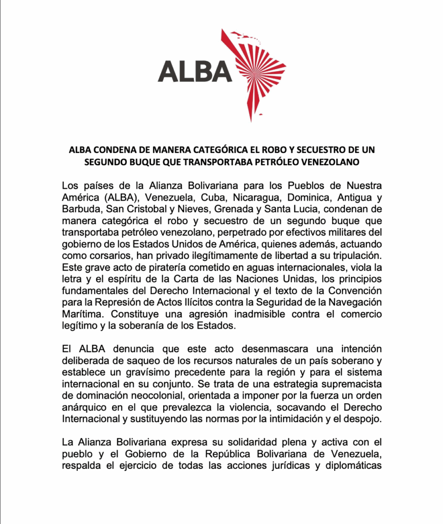 Los países de la Alianza Bolivariana para los pueblos de nuestra América (Alba), condenan “el robo y secuestro” de un segundo buque que transportaba petroleo venezolano, por parte de militares de EEUU.