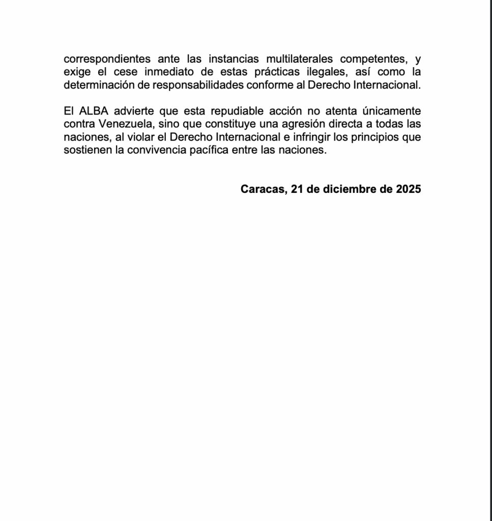 El Alba asegura que este acto “desenmascara una intención deliberada de saqueo de los recursos naturales de un país soberano y establece un gravísimo precedente para la región y para el sistema internacional en su conjunto”.
