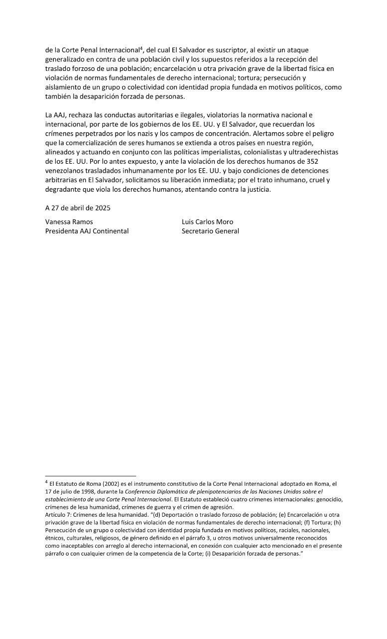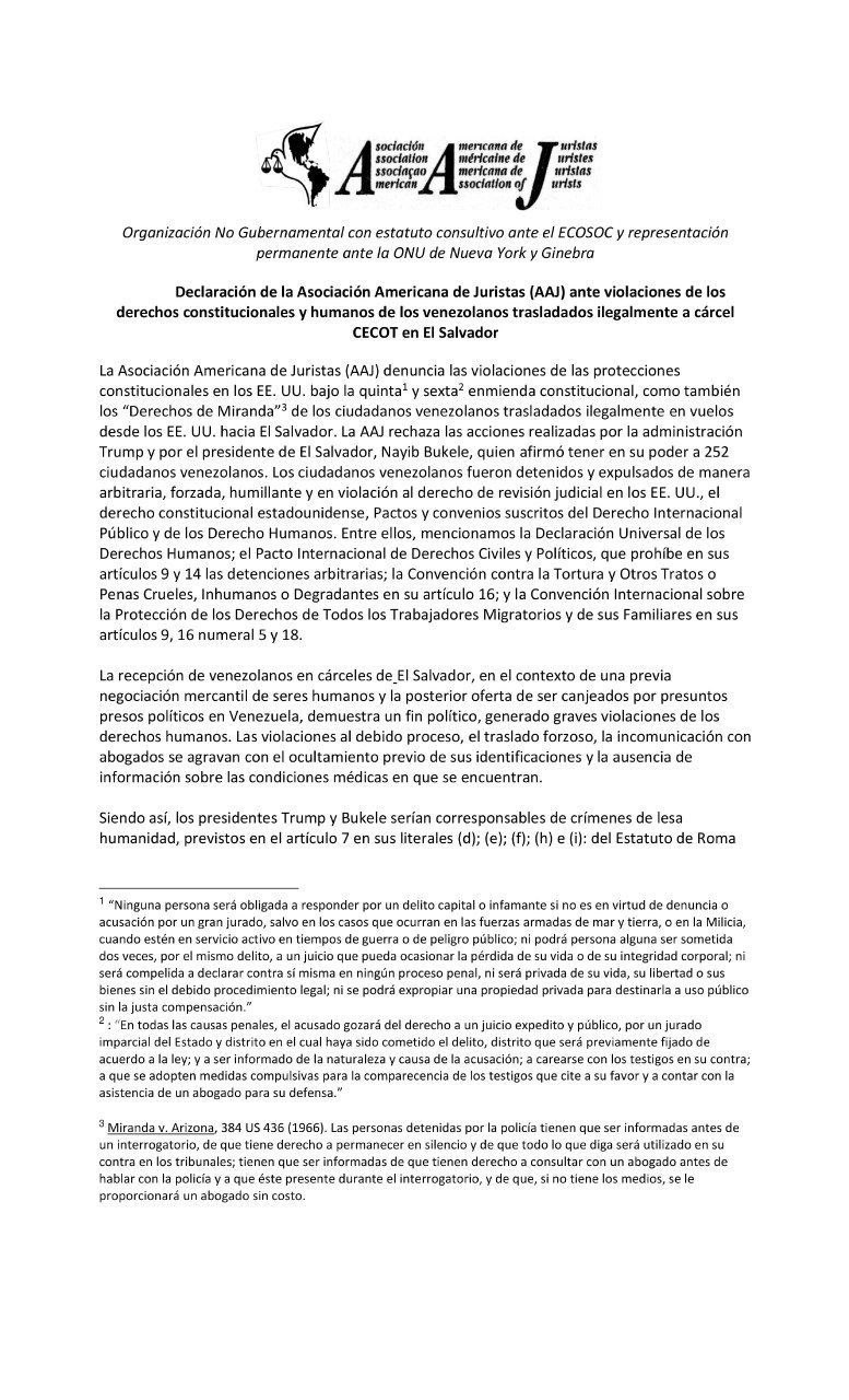 La Asociación Americana de Juristas (AAJ) denunció la violación de derechos garantizados en la Constitución de los Estados Unidos y de los derechos humanos de los venezolanos trasladados de manera ilegal a los centros de detención en El Salvador.