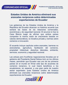 Por otra parte, —señala el texto— Estados Unidos se compromete a eliminar sus aranceles recíprocos sobre ciertas exportaciones ecuatorianas que cumplen con los requisitos y que no pueden cultivarse, extraerse ni producirse de forma natural en Estados Unidos en cantidades suficientes, indicó la Casa Blanca.