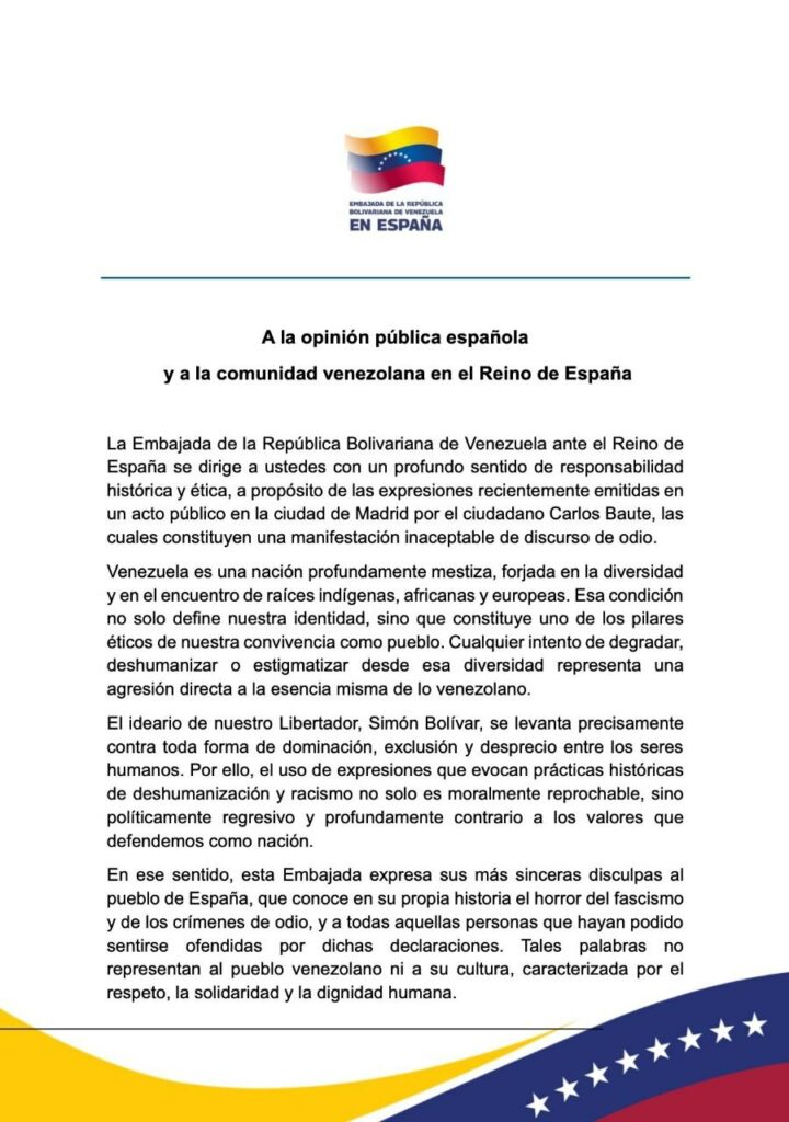 La Embajada de la República Bolivariana de Venezuela ante el Reino de España emitió un comunicado dirigido a la opinión pública española donde expresó su rechazo ante las expresiones emitidas por el ciudadano Carlos Baute en un acto público en Madrid.