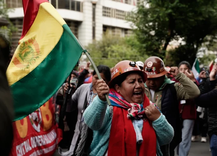 En esa y otras ciudades del país sudamericano manifestantes portaron carteles exigiendo al gobierno que revoque su último decreto que contempla varias medidas económicas, así como la bandera indígena de Bolivia mientras gritaban “el pueblo unido jamás será vencido”.