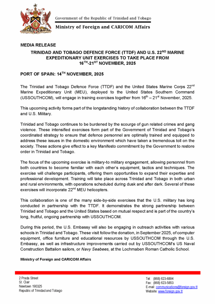 Trinidad y Tobago realizará ejercicios militares conjuntos con la Unidad Expedicionaria de Marines de Estados Unidos. La actividad se desarrollará entre el 16 y el 21 de noviembre del presente año. El ministro de Asuntos Exteriores y de la Caricom, Sean Sobers, confirmó la colaboración a través de un comunicado oficial.