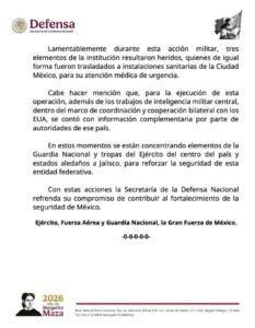 “La Secretaría de la Defensa Nacional de México se hace del conocimiento a la opinión pública que, con trabajos de inteligencia militar central, del Centro Nacional de Inteligencia y de la Fiscalía General de República (Femdo), Fuerzas Especiales del Ejército Mexicano planearon y ejecutaron una operación en Tapalpa, Jal., en la que intervinieron diversas aeronaves de la Fuerza Aérea y la Fuerza Especial de Reacción Inmediata de la Guardia Nacional para lograr la detención de Ruben ‘N’ (a) “El Mencho”.