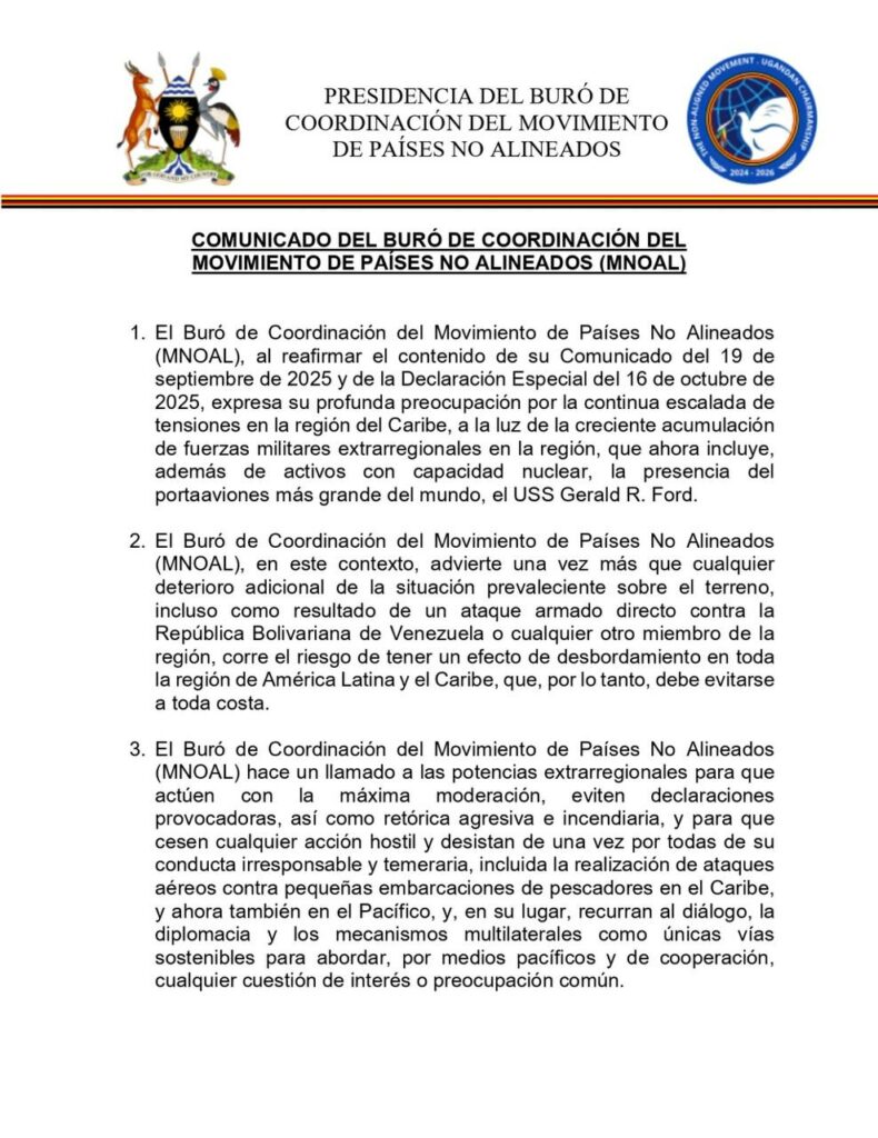 El Movimiento de Países No Alineados (Mnoal) reafirmó el contenido y la declaración oficial del 19 de septiembre y 16 de octubre, donde expresan su profunda preocupación por la continua escalada de tensiones en el Caribe a la luz de la creciente acumulación de fuerzas militares en la región, que ahora incluye, además de activos con capacidad nuclear, la presencia del portaaviones más grande del mundo, el USS Gerald Ford.