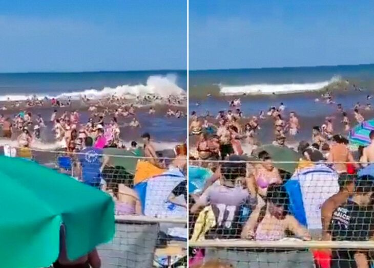 La playa estaba llena de turistas, cuando de repente una ola de cinco metros tomó por sorpresa a los visitantes y los arrastró con fuerza.