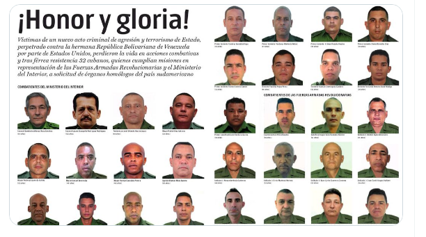 Tras el ataque, el presidente Miguel Díaz-Canel dijo que los combatientes ayudaban a proteger al liderazgo venezolano por solicitud de esa nación. «Comparto dolor e indignación con nuestro pueblo y, especialmente, con los seres queridos de nuestros valerosos compañeros».