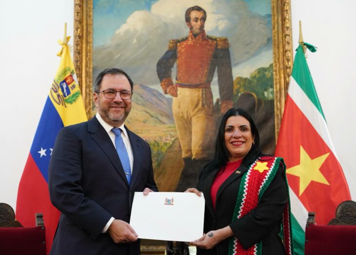 El ministro del Poder Popular para Relaciones Exteriores, Yván Gil, recibió este miércoles las Copias de Estilo de la embajadora de la República de Suriname designada ante la República Bolivariana de Venezuela, Georgette García Elías.