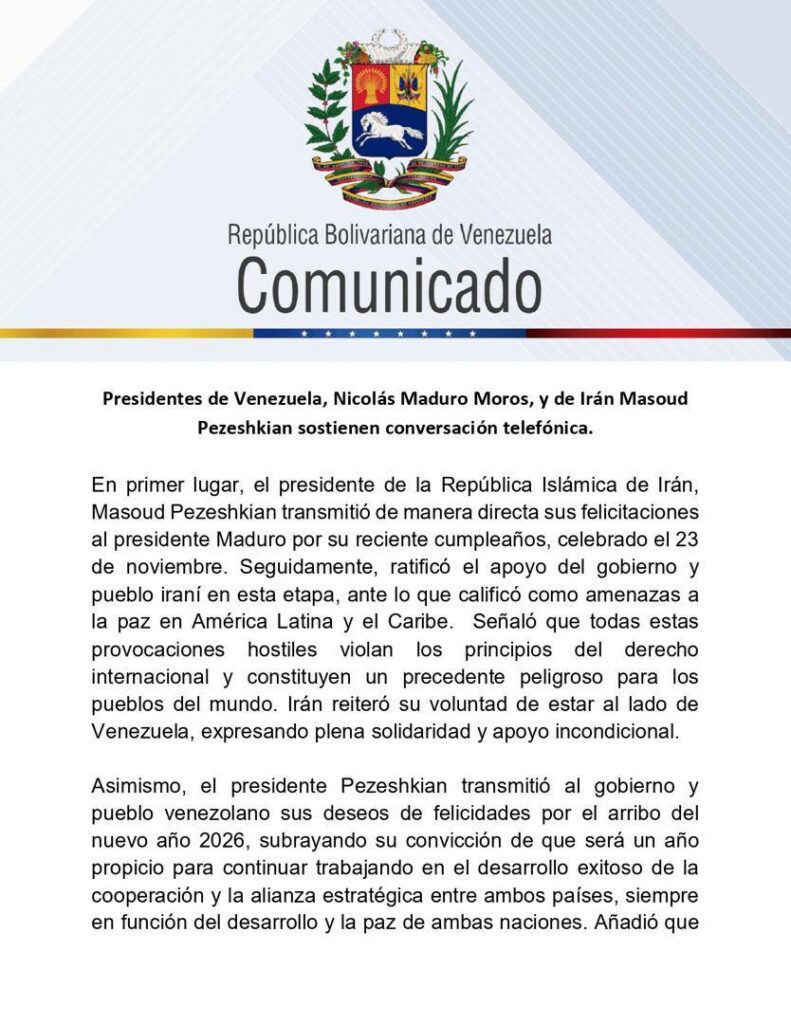 A través de un comunicado oficial, se destaca que Pezeshkian reiteró el apoyo del gobierno y pueblo iraní en esta etapa, ante lo que calificó como amenazas a la paz en América Latina y el Caribe.
