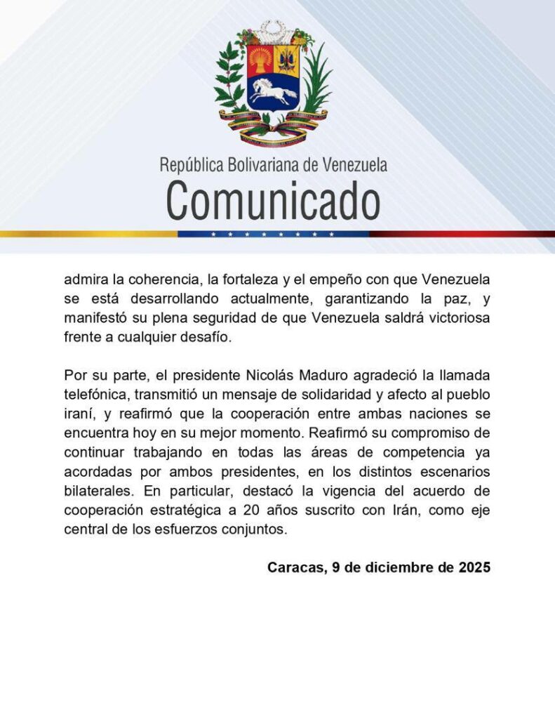 Por su parte, el jefe de Estado, Nicolás Maduro, expresó un mensaje de solidaridad y afecto al pueblo iraní, y reafirmó que la cooperación entre ambas naciones se encuentra hoy en su mejor momento.