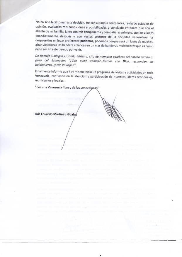 Dijo haber tomado la decisión tras consultar a centenares y revisar innumerables estudios de opinión que dan un claro panorama de la situación actual del partido. Ahora, el exgobernador del estado Monagas, dejó claro que desde la entrega de esta comunicación inició un programa de actividades por toda Venezuela.