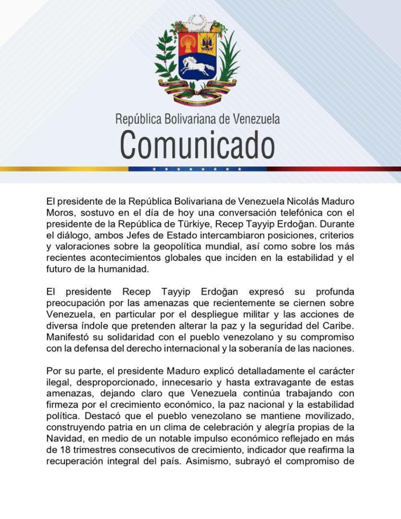 Por su parte, Erdoğan manifestó su solidaridad con el pueblo venezolano y su compromiso con la defensa del derecho internacional y la soberanía de las naciones.