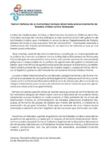 La Red de Intelectuales, Artistas y Movimientos Sociales en Defensa de la Humanidad emitió un comunicado público donde repudia, rechaza y condena enérgicamente la más reciente acción del Gobierno de los Estados Unidos (EE.UU.) contra Venezuela.