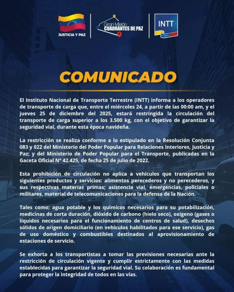 El Instituto Nacional de Transporte Terrestre (Intt) anunció que la circulación de vehículos de carga con peso superior a los 3.500 kilogramos estará restringida en todo el territorio nacional durante los días 24 y 25 de diciembre de 2025.