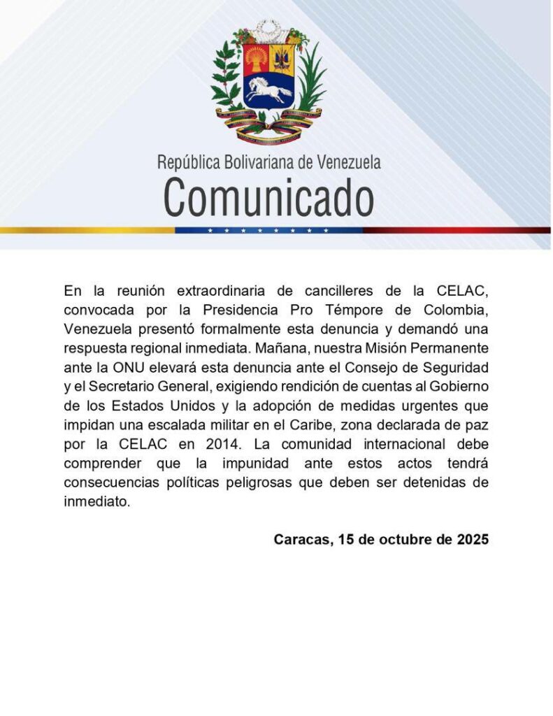 Venezuela presentó una denuncia formal ante la Comunidad de Estados Latinoamericanos y Caribeños (Celac) y anunció que elevará el caso ante la Organización de Naciones Unidas (ONU), tras rechazar públicamente declaraciones del presidente de los Estados Unidos donde “admiten públicamente haber autorizado operaciones para actuar contra la paz y la estabilidad de Venezuela”.