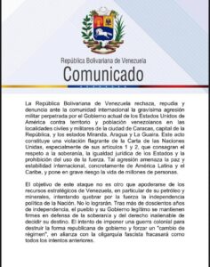 REPÚBLICA BOLIVARIANA DE VENEZUELALa República Bolivariana de Venezuela rechaza, repudia y denuncia ante la comunidad internacional la gravísima agresión militar perpetrada por el Gobierno actual de los Estados Unidosde América contra territorio y población venezolanos en las localidades civiles y militares de la ciudad de Caracas, capital de la República, y los estados Miranda, Aragua y La Guaira. Este acto constituye una violación flagrante de la Carta de las Naciones Unidas, especialmente de sus artículos 1 y 2, que consagran el respeto a la soberanía, la igualdad jurídica de los Estados y la prohibición del uso de la fuerza. Tal agresión amenaza la paz y estabilidad internacional, concretamente de América Latina y el Caribe, y pone en grave riesgo la vida de millones de personas.El objetivo de este ataque no es otro que apoderarse de los recursos estratégicos de Venezuela, en particular de su petróleo y minerales, intentando quebrar por la fuerza la independencia política de la Nación. No lo lograrán. Tras más de doscientos años de independencia, el pueblo y su Gobierno legítimo se mantienen firmes en defensa de la soberanía y del derecho inalienable de decidir su destino. El intento de imponer una guerra colonial para destruir la forma republicana de gobierno y forzar un “cambio de régimen”, en alianza con la oligarquía fascista fracasará como todos los intentos anteriores.Desde 1811, Venezuela ha enfrentado y vencido imperios. Cuando en 1902 potencias extranjeras bombardearon nuestras costas, el Presidente Cipriano Castro proclamó: “La planta insolente del extranjero ha profanado el sagrado suelo de la Patria.” Hoy, con la moral de Bolívar, Miranda y nuestros libertadores, el pueblo venezolano se alza nuevamente para defender su independencia ante la agresión imperial.
