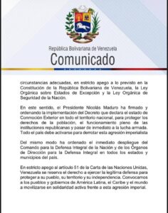 En este sentido, el Presidente Nicolás Maduro ha firmado y ordenando la implementación del Decreto que declara el estado de Conmoción Exterior en todo el territorio nacional, para proteger los derechos de la población, el funcionamiento pleno de las instituciones republicanas y pasar de inmediato a la lucha armada. Todo el país debe activarse para derrotar esta agresión imperialista