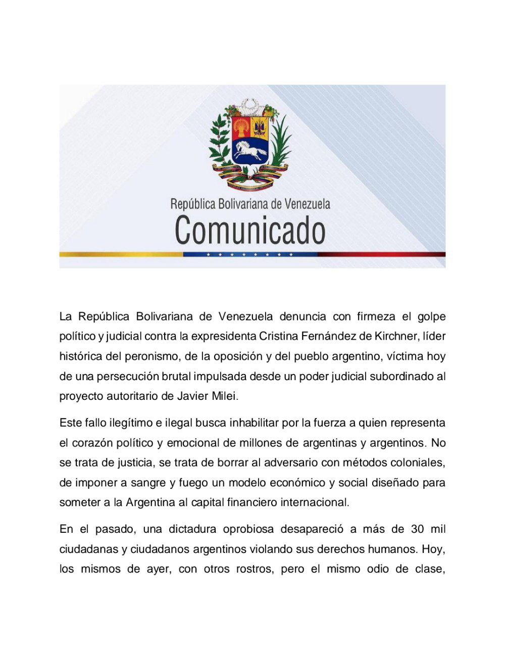La República Bolivariana de Venezuela denuncia con firmeza el golpe político y judicial contra la expresidenta Cristina Fernández de Kirchner.