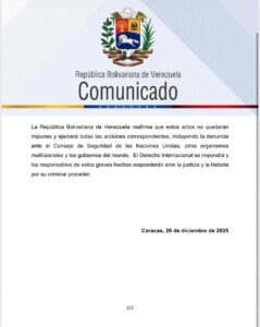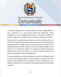 La administración venezolana calificó el suceso como un acto de “piratería” que vulnera normativas internacionales, citando el Convenio para la represión de actos ilícitos contra la seguridad de la navegación marítima de 1988 y la Carta de las Naciones Unidas.
