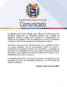 El Ministerio de Relaciones Exteriores de Venezuela emitió un comunicado, la noche del sábado 10 de enero, en respuesta al llamado que hiciera el Departamento de Estado de Estados Unidos a su gente que se encuentra en el país, ante una supuesta persecución de los colectivos.