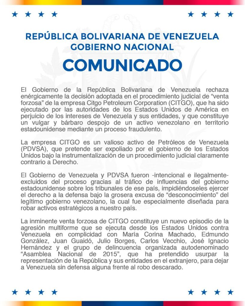 El comunicado del Gobierno Nacional señala que Citgo es un “valioso activo de Petróleos de Venezuela (Pdvsa)” que “pretende ser expoliado por el gobierno de los Estados Unidos”. Las autoridades venezolanas sostienen que fueron “intencional e ilegalmente excluidos del proceso” judicial en EEUU..