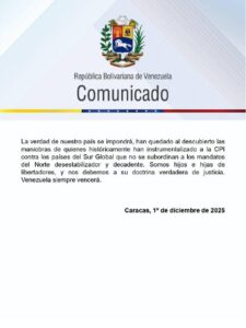 De acuerdo con el comunicado emitido por la Cancillería de la República, el país denuncia que el Fiscal Adjunto “desatiende sus deberes para justificar colonialismo jurídico contra Venezuela mientras ignora genocidio de Israel”. el documento también señala que la vinculación de Venezuela con la Fiscalía de la CPI “no encaja en los supuestos previstos en el Estatuto de Roma, pero que pretende satisfacer la agenda anti Venezuela impulsada desde centros hegemónicos”.