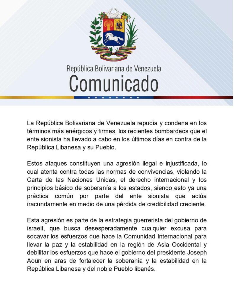 Venezuela rechaza y condena de manera firme este viernes los recientes ataques aéreos realizados por Israel en los últimos días contra el Líbano y su población.