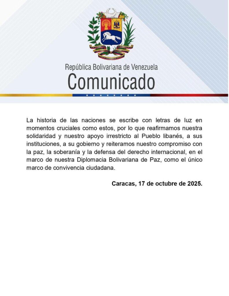 El Gobierno nacional reitera su “solidaridad y apoyo incondicional al pueblo libanés, a sus instituciones y a su Gobierno”.