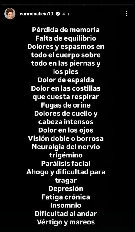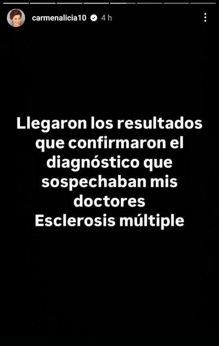 Luego de una serie de estudios médicos y una exhaustiva búsqueda por parte de los especialistas diagnosticaron a Carmen Alicia Lara con esclerosis múltiple. “Llegaron los resultados que confirmaron el diagnóstico que sospechaban mis doctores de esclerosis múltiple”, informó a sus seguidores.