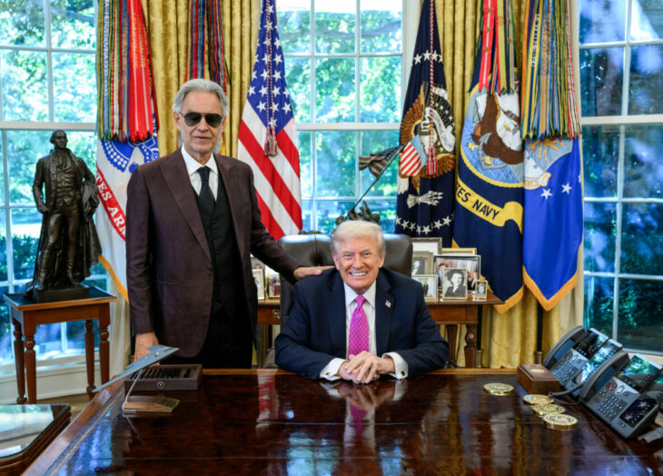 El tenor italiano Andrea Bocelli visitó este viernes al presidente de Estados Unidos, Donald Trump, en la Casa Blanca e interpretó su famosa canción “Con te partirò” (“Por ti volaré”) en el Despacho Oval.