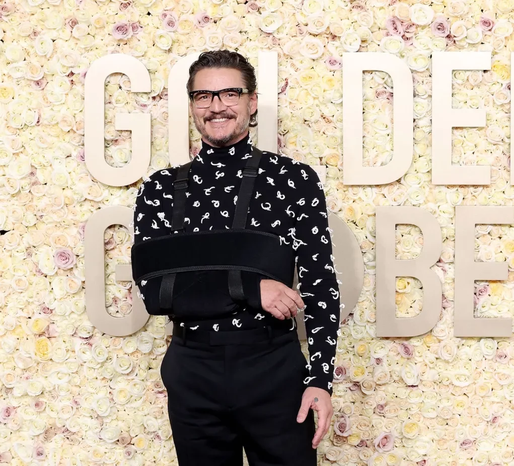 Otros accesorios nacieron de la necesidad: Pedro Pascal lució un fular oscuro en el brazo a juego con su traje negro de Bottega Veneta.