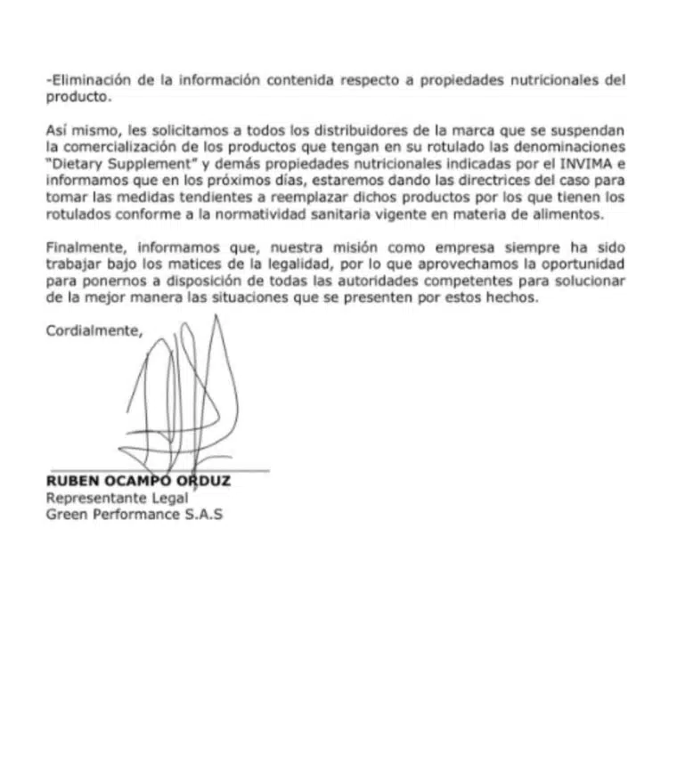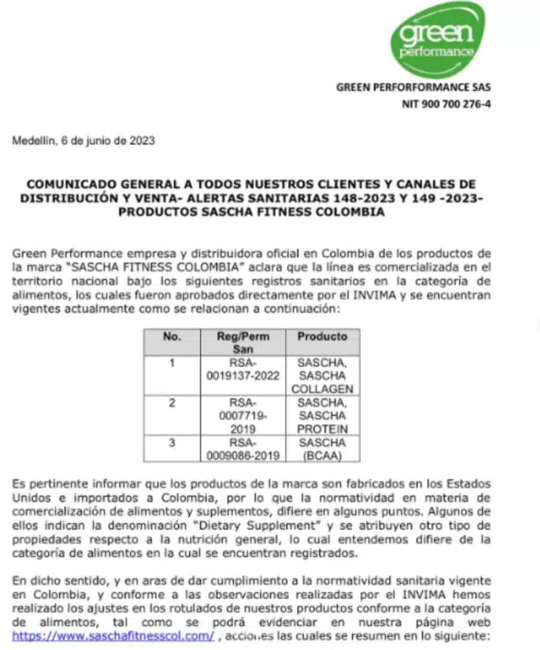 La empresa Green Performance, encargada de distribuir los suplementos de Sascha Fitness en Colombia, responsabilizó al mercado negro de los productos que no cuenta con el debido registro, según la reseña de El Diario.