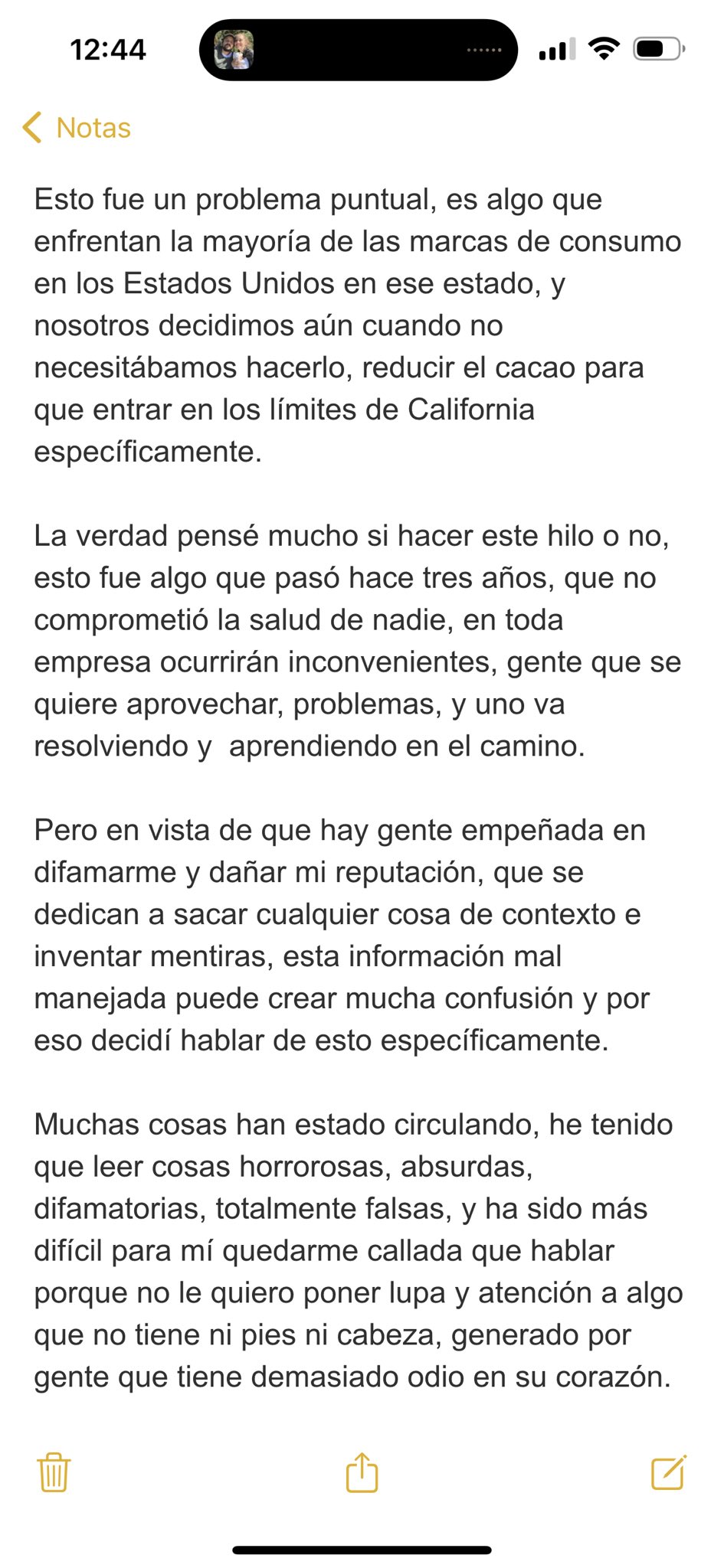 Ya la influencer había emitido un comunicado en el que destacó sus más de 10 años de carrera y cinco de su empresa: “Para mí siempre ha sido importante hacer las cosas por el camino correcto. La credibilidad, la ética y la honradez han sido la brújula que siempre ha regido mis caminos”.