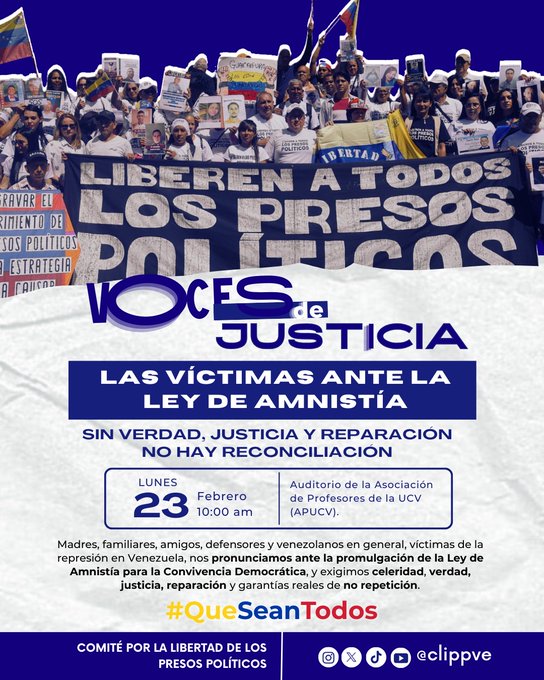 El Comité por la Libertad de los Presos Políticos (Clippve) anunció que realizará una audiencia pública este lunes en la sede de la Asociación de Profesores de la UCV (Apucv).