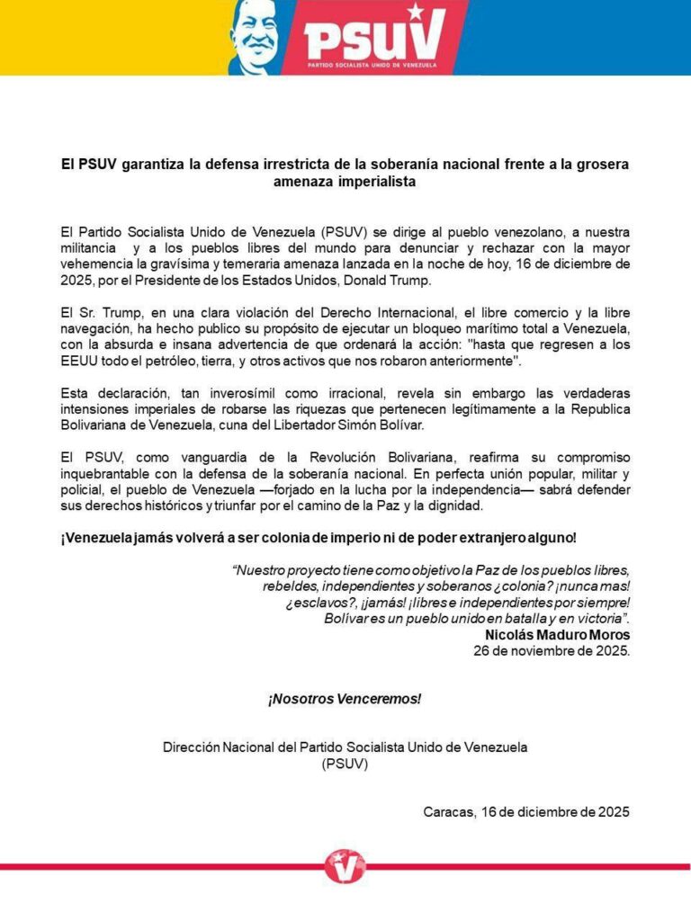 “El Psuv, como vanguardia de la revolución bolivariana, reafirma su compromiso inquebrantable con la defensa de la soberanía nacional. En perfecta unión popular, militar y policial, el pueblo de Venezuela -forjado en la lucha por la independencia sabrá defender sus derechos históricos y triunfar por el camino de la paz y la dignidad. ¡Venezuela jamás volverá a ser colonia de imperio ni de poder extranjero alguno!”, puntualizaron.