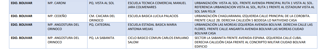 Mencionó que ya cuentan con 31 mesas en todo el estado y se mantienen centros anteriores: dos en Ciudad Bolívar y uno en cada municipio restante.