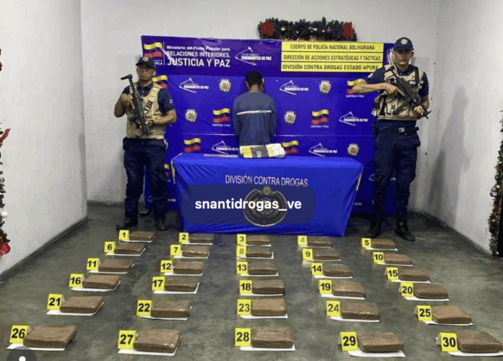 Funcionarios del Cuerpo de Policía Nacional Bolivariana (Cpnb) detuvieron a un hombre de 47 años en el estado Apure, tras incautarle un cargamento de presunta droga. El procedimiento se realizó en el marco de la lucha contra el tráfico ilícito de sustancias estupefacientes y psicotrópicas.