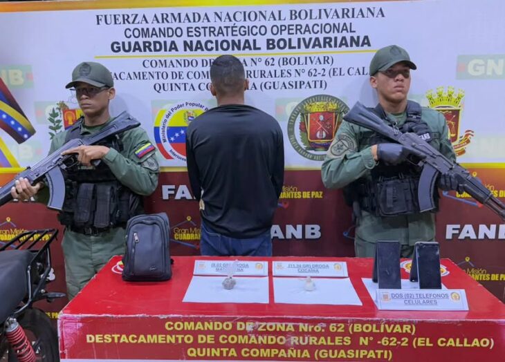 Efectivos de la Guardia Nacional Bolivariana en el estado Bolívar lograron la aprehensión de un ciudadano en el sector de Guasipati, municipio Roscio. El sujeto detenido trasladaba 11,34 gramos de presunta cocaína y 8,03 gramos de presunta marihuana.