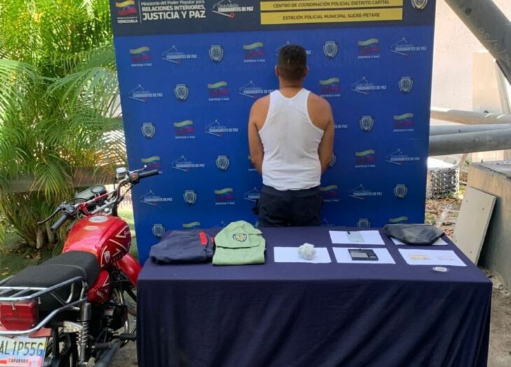 Durante el procedimiento de los uniformados de la PNB, adscritos a la Estación Policial Municipal Sucre se incautó un envoltorio de presunta sustancia psicotrópica “cripy” con un peso de 57,70 gramos, una balanza digital, un teléfono celular, una motocicleta color rojo, un bolso negro y un uniforme de la Policía Municipal de Caracas.